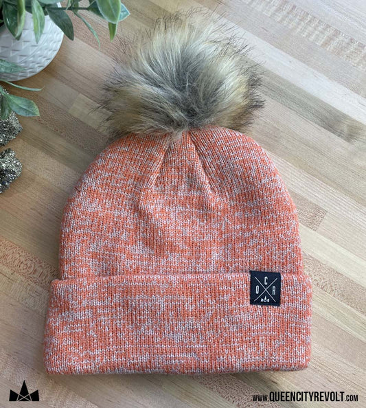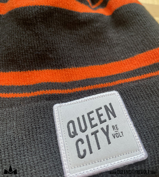 Knit Pom Beanie, Black Orange Stripe/Black Patch